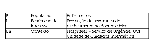 Foi realizada uma revisão integrativa da literatura, com a finalidade de sintetizar resultados de pesquisas previamente realizadas sobre a temática em estudo. Para organização da informação foi utilizado o modelo Preferred Reporting Items for Sytematic reviews and Meta-Analyses [Prisma] (2015). Posteriormente, foram avaliados os artigos escolhidos tendo por base os critérios de inclusão previamente estabelecidos, fazendo-se, concomitantemente, uma recolha preliminar das suas principais conclusões. Foi estabelecida a seguinte questão de investigação: “Quais as intervenções de enfermagem que promovem a segurança do medicamento no doente crítico?”, tendo como referência a estratégia PICO (Tabela 1), bem como a definição dos critérios de inclusão e exclusão (Tabela 2). A presente revisão integrativa da literatura tem como objetivo o mapeamento das intervenções de enfermagem que promovem a segurança do uso do medicamento no doente crítico.