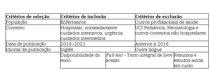 Procedeu-se à pesquisa para identificação dos descritores, tendo estes sido validados no MeSH (Medical Subject Headings): Critical Care Nursing, Drug Therapy e Patient Safety. Foi realizada a sua interseção através do operador booleano [AND], pela ordem anteriormente descrita. Foram selecionados os motores de busca PubMed, EBSCO, Scielo e B-On, pela sua abrangência e elevado reconhecimento na área da saúde, com os seguintes limitadores: free full text, últimos 5 anos (2016-2021) e língua inglesa. A pesquisa foi realizada durante o mês de janeiro de 2021. Na amostra inicial foram incluídos 170 artigos. Utilizou-se a metodologia PRISMA (Moher, Liberati, Tetzlaff, & Altman, 2009) para sistematizar o processo de inclusão dos estudos, estando a seleção dos artigos espelhada no diagrama de fluxo (Figura 1). O nível de evidência utilizado para a sua análise foi o proposto por Melnyk & Fineout-Overholt (2011).