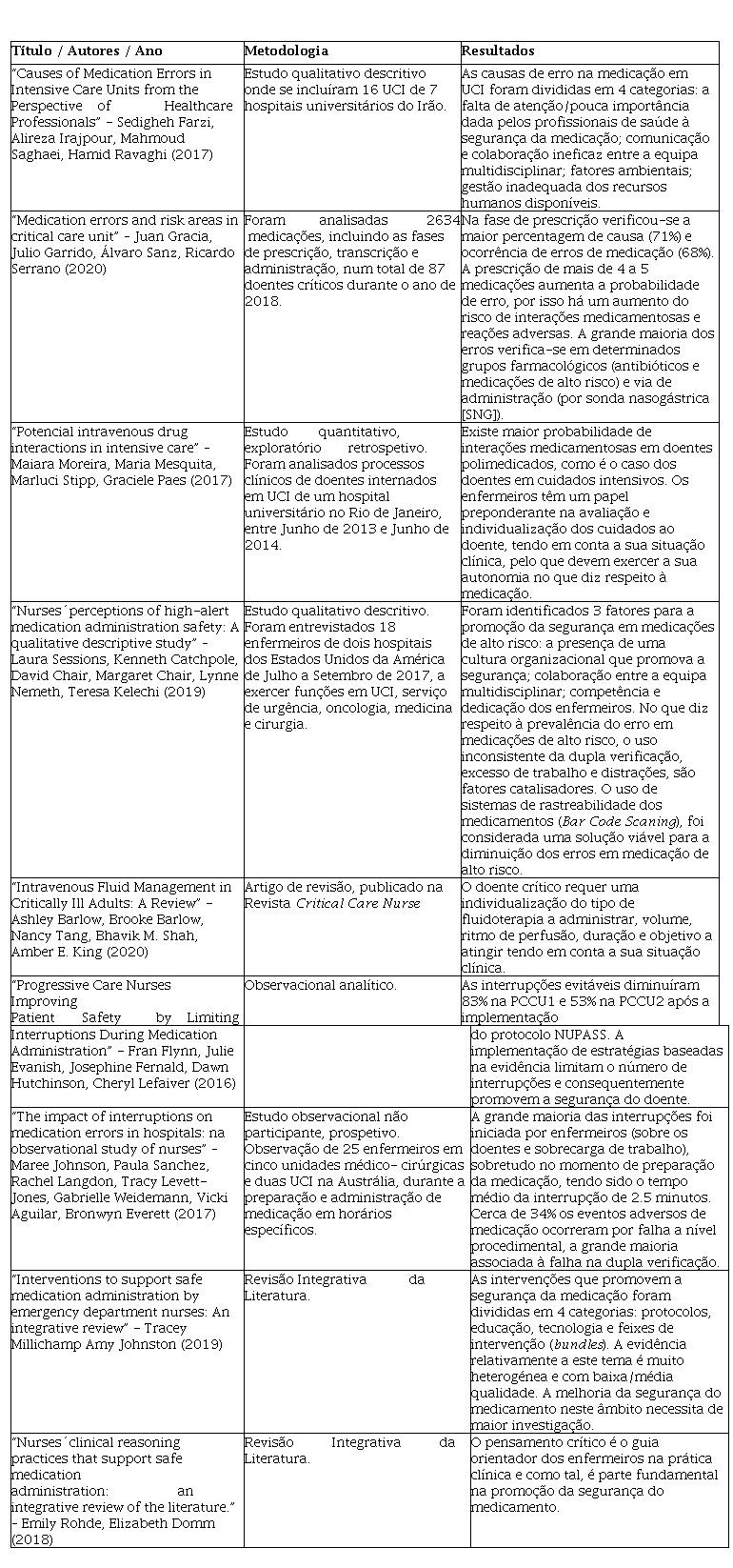 Abstract: Background: the critically ill patient is particularly vulnerable to medication-related incidents, due to the high complexity of care. Aims: analyze the nursing interventions that promote medication safety in critical care patients. Methodology: integrative review on four data-bases, PubMed, EBSCO, Scielo and B-On. Nine articles were included. Results: medication safety is considered a major quality indicator in healthcare organizations. Implementing a safety culture is important, since it recognizes that highly risk interventions are performed and error is inevitable. The complexity of care in critically ill patients implies a vulnerable condition, where multiple medications are needed, which when associated with stress and poor nurse-patient ratio, can result in medication errors. The healthcare team should be aware of all stages of medication; therefore, communication is essencial in medication safety. Conclusion: the nursing team, as key- elements of care delivery in critically ill patients, have an important role in medication safety. Therefore, the process of preventing errors is a considerate challenge, requiring evaluation and monitoring thorough. The nursing team has to guarantee a safe efficient and focused care for the patient and family.