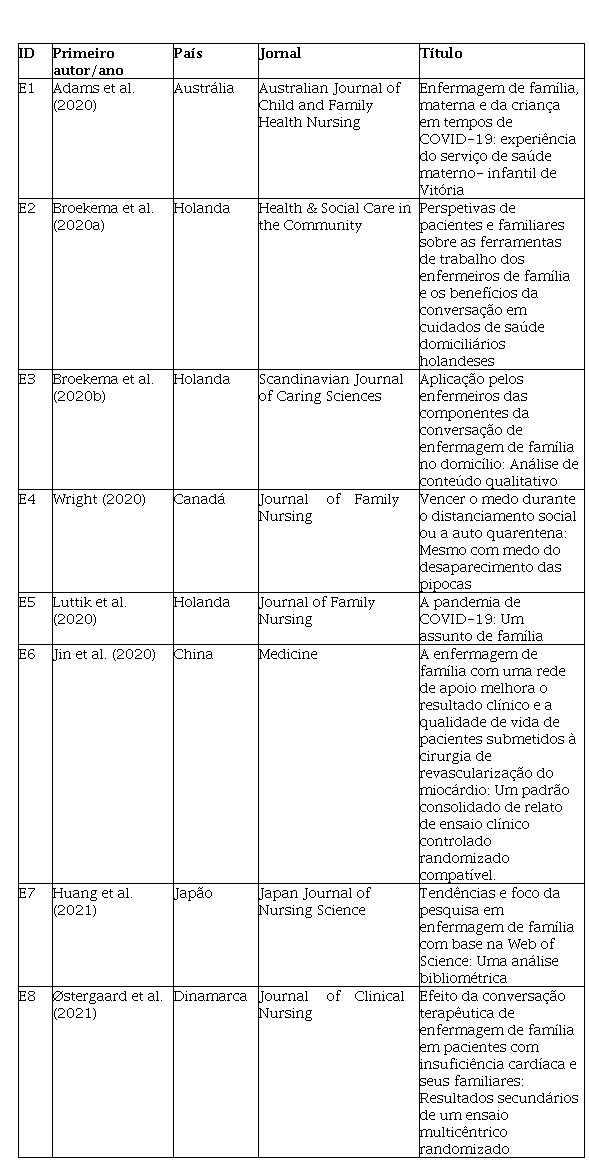 Relativamente à conexão entre as palavras enfermagem, família, futuro, cuidados e enfermagem incluídas nos estudos E7 e E8, esta permitiu enfatizar que a enfermagem de família precisa ser mais explorada no sentido de fornecer cuidados de enfermagem mais direcionados ao apoio social, para o fortalecimento da saúde da família e melhoria do bem- estar dos pacientes. Patungo et al. (2021) encontraram resultados semelhantes no seu estudo.