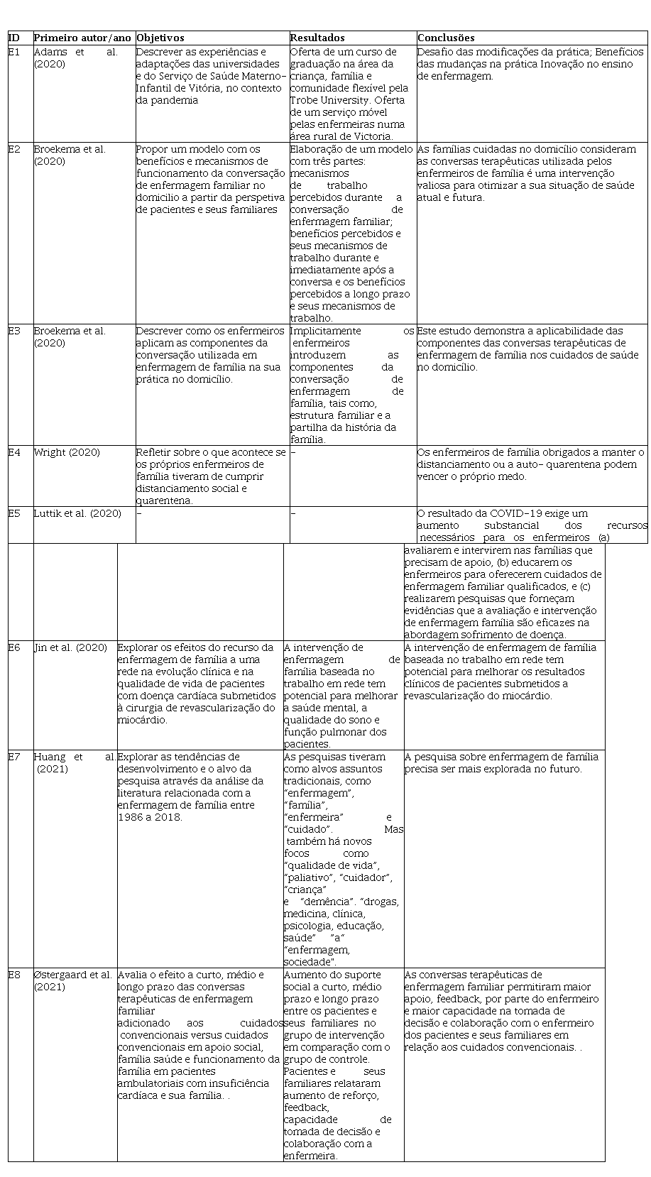 Na tabela 2 observa-se que 50% dos estudos abordam estratégias de intervenção utilizadas em enfermagem de família: três estudos abordam as conversas terapêuticas (Broekema et al., 2020a; Broekema et al., 2020b; Østergaard et al. et al., 2021) e um aborda o recurso ao trabalho em rede (Jin et al., 2020).