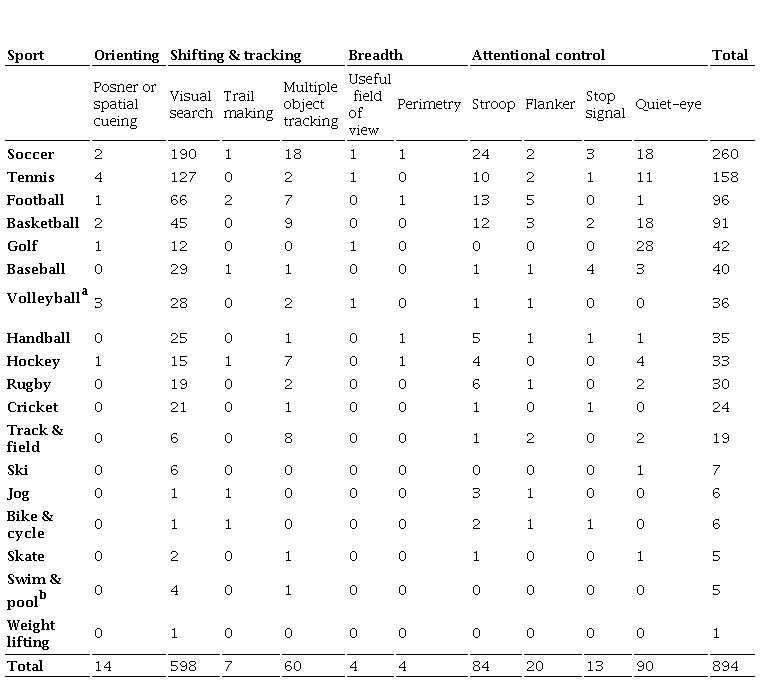 We caution that the frequency values in Table 1 should not be considered as an exclusive categorization of sport types, attention measures, or journal articles. There is possible overlap in these numbers, because some journal articles refer to more than one sport and also to more than one measure of attention. Some of these articles may also mention a specific measure of attention and sport, but only as an implication or suggestion in light of a more disparate topic under study. The tabled values simply represent the number of peer-reviewed journal articles that make reference in their titles, abstracts, and key-words to the particular conjunctions of terms given in the rows and columns of the table. These results are also based on a single search engine, Web of Science. As such, we offer these data as an approximate indication of the relative frequency with which these concepts have been combined in scholarly articles.