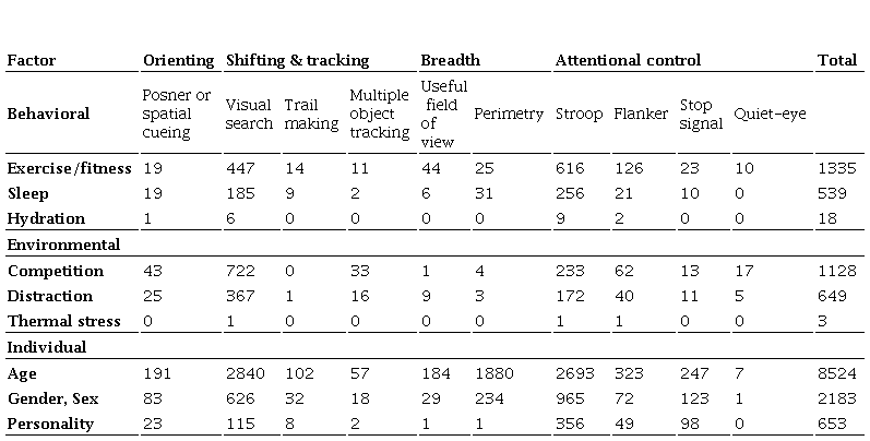 We determined the entries in Table 2 by combining several criteria, including that a paper had to reference one of the attention tasks we reviewed in the previous section and that a paper had to reference one of the specific terms we grouped into behavioral practices, environmental conditions or individual differences. These terms emerged both from the factors that attention theorists are now considering to be important for understanding attention (see section 4) and from their relative popularity as factors to be considered in the sports literature. As in the previous section, these terms should be taken as representative, but not exhaustive, of a larger body of literature. The values in Table 2 therefore represent the frequency with which peer-reviewed articles were found in August 2020, using Web of Science, that refer both to the real-world factors we review and of the attention tasks we have already discussed.