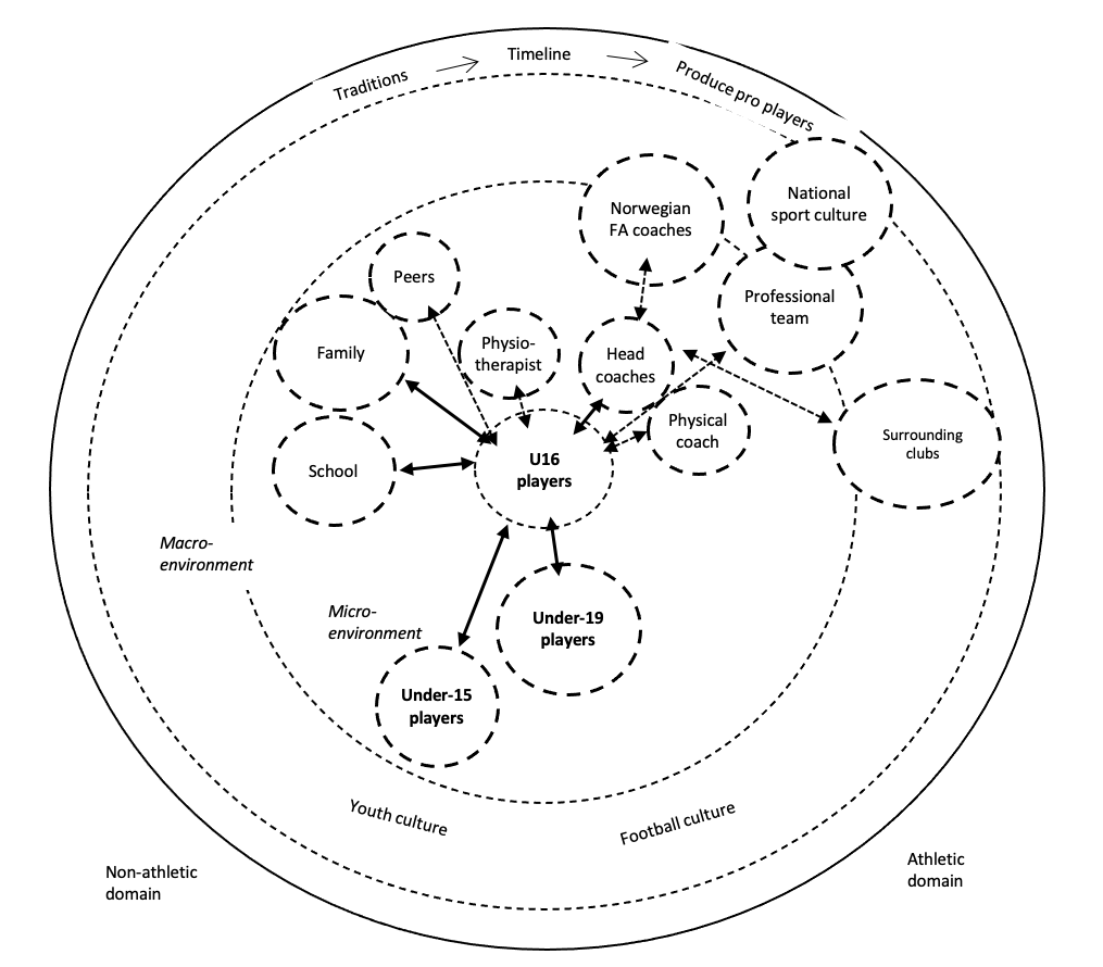 Football is a sport in which the talent development focus has been strong for decades. Most professional football clubs want to provide high-quality talent development environments and strategies arranged in academies to provide players for the club’s professional team. Given the changing requirements encountered along the path to becoming a professional footballer, it is important to understand the process that young footballers go through at different stages of development (Nesti & Sulley, 2015). Being part of a professional football team and culture can be quite challenging for even the most talented footballers, as indicated by the high dropout rate in academy football (Güllich, 2014). Based on the complexity of athlete development, adopting a holistic approach to athlete development environments might be essential (Henriksen et al., 2010a). A holistic talent development approach emphasises the player’s importance in an environment of clubs, coaches, parents, teachers, and friends, who all might facilitate the players’ development (Nesti & Sulley, 2015).