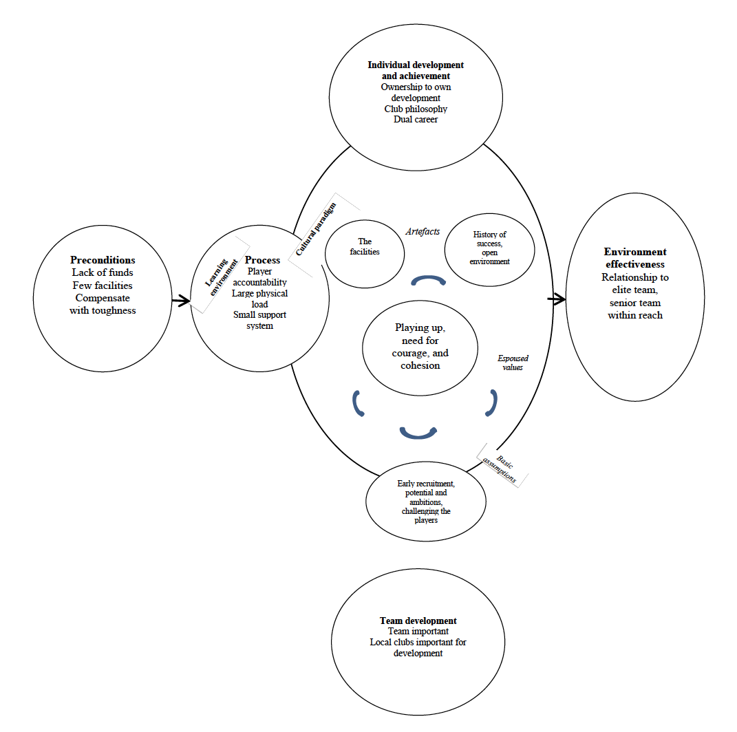 The empirical ESF model (Figure 2) is a general representation of the talent development process, showing the main features which occur over years. Figure 2 shows that the pre-conditions (i.e., financial and physical context) in Stabæk FC included financial difficulties, few facilities, and how coaches and players attempted to counter these with increased toughness. The common process of talent development included significant focus on the players’ own responsibility, a large physical training load, and a small support system compared to other clubs in Norway. Further, the cultural paradigm (i.e., artefacts, values, and assumptions) included an espoused value of playing up (i.e., playing against older age groups) and assumptions related to early recruitment. We also found that there were some intra-cultural conflicts between the culture in the club and the national culture. The historic outcomes of individual development and achievement as well as team development showed that the ATDE had a history of relatively high effectiveness suggesting that becoming an elite senior player was within reach to the current players in the academy.