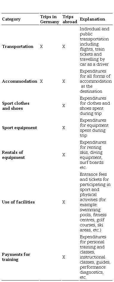 The initial purpose of the collected data was to determine the consumption of sport by German households with respect to the German economy. Therefore, data on consumption of German households abroad were collected in greater detail. It is important to distinguish whether ski equipment was bought during a trip outside Germany (that is, an import) or whether someone bought their ski equipment in Germany: In the latter case, it is irrelevant for the economic effect whether that equipment is used for active sport tourism in Germany or for daily training, for example, by someone living close to a ski resort (which would not be counted as tourism). Thus, we can determine the spending abroad (see Table 2) in greater detail than the consumption of those making a domestic trip.