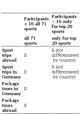What is the amount spent for certain goods purchased on these trips abroad? What overall expenditures were incurred by the trips in Germany and abroad? What is, on average, spent for different types of sport? Which sport causes more trips in relation to those sports practiced without trips? The data provided here are of particular importance for gaining an understanding of the economic dimension of active sport tourism, because it becomes obvious what German households import by purchasing goods and services outside Germany. In national statistics, these data are also not available.