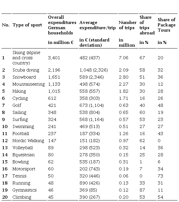 Table 4 displays the data diverted into the top twenty types of sport and by individual average expenditures. It is noteworthy that the trips in the tables include trips to training camps, which can be seen as completely different types of active sport tourism to vacation-oriented trips (i.e. volleyball-camp vs. hiking holiday).