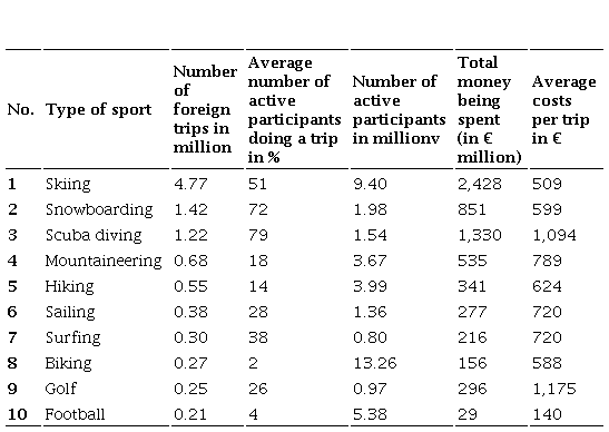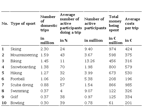 Considering all 71 types of sport, members of German households ≥ 16 years went on approximately 28 million trips in 2010 (there is no information on how many members of a household travel together as individuals were surveyed). With respect to a population of 80 million people, this is an extremely high number of instances of sport-related travel. Germans went on at least 113 million trips in Germany alone in 2010 (Deutscher Tourismusverband, 2011). On average, Germans spent € 460 for each sport-related trip. Thus, German households have spent around € 12.8 bn in 2010.