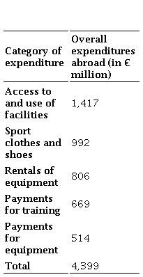 Besides their expenditures for transportation, food and beverages, and accommodation, German households spent another € 4.4 bn on sport goods and services when undertaking an international trip. Thus, German households contribute to the economies of many other nations. When we add up the top 10 sports undertaken at international destinations, German households spend € 6.46 bn on their trips. Altogether, the volume of trips, goods and services purchased abroad costs more than € 11 bn per year. However, this amount does not represent the imports effected by German households due to sport-related trips abroad, because the expenditures for transport, accommodation and food and beverages remain, to a large extent, within the German economy.