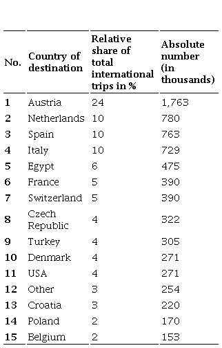 If these data are used to calculate the economic dimension of active sport tourism for the German economy, it is important to distinguish whether goods or services were purchased in Germany or abroad (imported). Therefore, we differentiated sport trips within Germany from sport trips abroad, which provides an interesting insight about the destinations visited by German households.