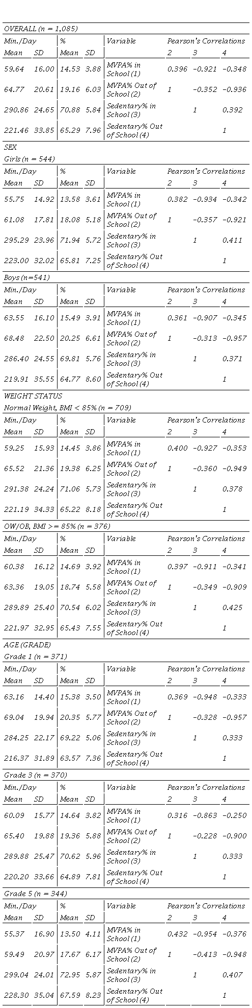 Minutes and percent of MVPA and SB in school and out of school and their correlación (all correlations are significant at p < 0.01; total n = 1,085).