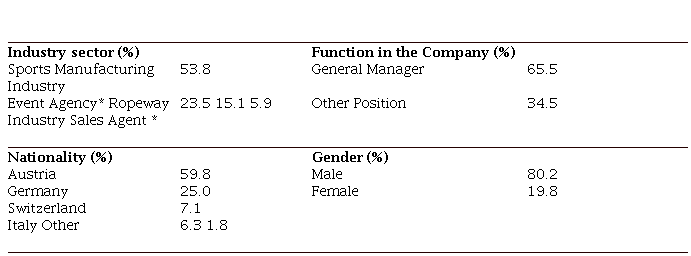 The online questionnaire was pretested and sent to 693 sport manufacturing businesses (classified directory, index of exhibitors) in Austria, Germany, Italy and Switzerland. This cross-border region represents an important area for the sport manufacturing industry (B2B). The questionnaire was predominantly answered by top-ranking managers in the respective organisations. The rate of return totalled 119 questionnaires (n=119; average age = 46.7), with 69 coming from Tyrol and 50 from the other specified markets. Sociodemographic and related data including information about industry sector, function in the company, nationality and gender, as well as specific information about the sport manufacturing businesses were collected (Table 1).