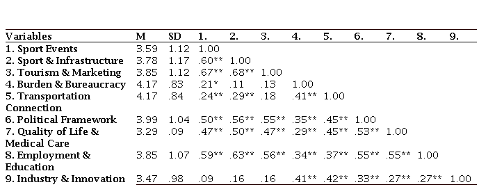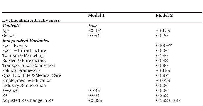 A series of hierarchical regression analyses was conducted to test for H1-H9 (Figure 1). The controls (i.e., Age, Gender, Educa-tion and Nationality) were entered into the first block (Model 1) and the predictors were entered into the second block (Model 2). The findings of the regression analyses are reported in Table 4. Sport Events positively affected the Attractiveness of Location (β = .369, p < .01, H1 supported). Attractiveness did not affect Sport & Infrastructure, Tourism & Marketing, Burden & Bureaucracy, Transport Links, Political Framework, Quality of Life & Medical Care, Employment & Education and Industry & Innovation (see Table 4, H2-H9 not supported). The control variables did not significantly affect the dependent variables (overall construct, . = 4.059, SD = .959)