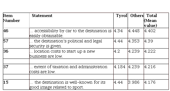 In order to answer the second research question, the importance of statements was analysed. The following items either scored highest or were most important for the overall sample (Table 5): “accessibility by car to the destination is easily obtainable” (4.402); “the destination’s political and legal security is given” (4.390); “location costs to start up a business are low” (4.222). The lowest scores appeared for “the destination is running programmes in sports medicine research” (2.899) and “the destination offers good international shopping opportunities” (3.093). Furthermore, in the Tyrolean dataset, items like “destination is well-known for its good image related to sport” (4.44) scored very high compared to the Others dataset, where the item “extent of taxation and administration costs are low” (4.239) scored very high. When looking at the combined positive scores, indications are that Burdon & Bureaucracy (Factor 4) and Transport Connections (Factor 5) are very important for all stakeholders. Compared to the overall results, the Tyrolean sport manufacturing businesses set a high value on a destination’s good sport-related image. By contrast, the other markets gave sport and image relatively low scores (3.986) compared to the extent of taxation and administration costs, as those items constituting Factor 4 (Burden & Bureaucracy) are considered very important.