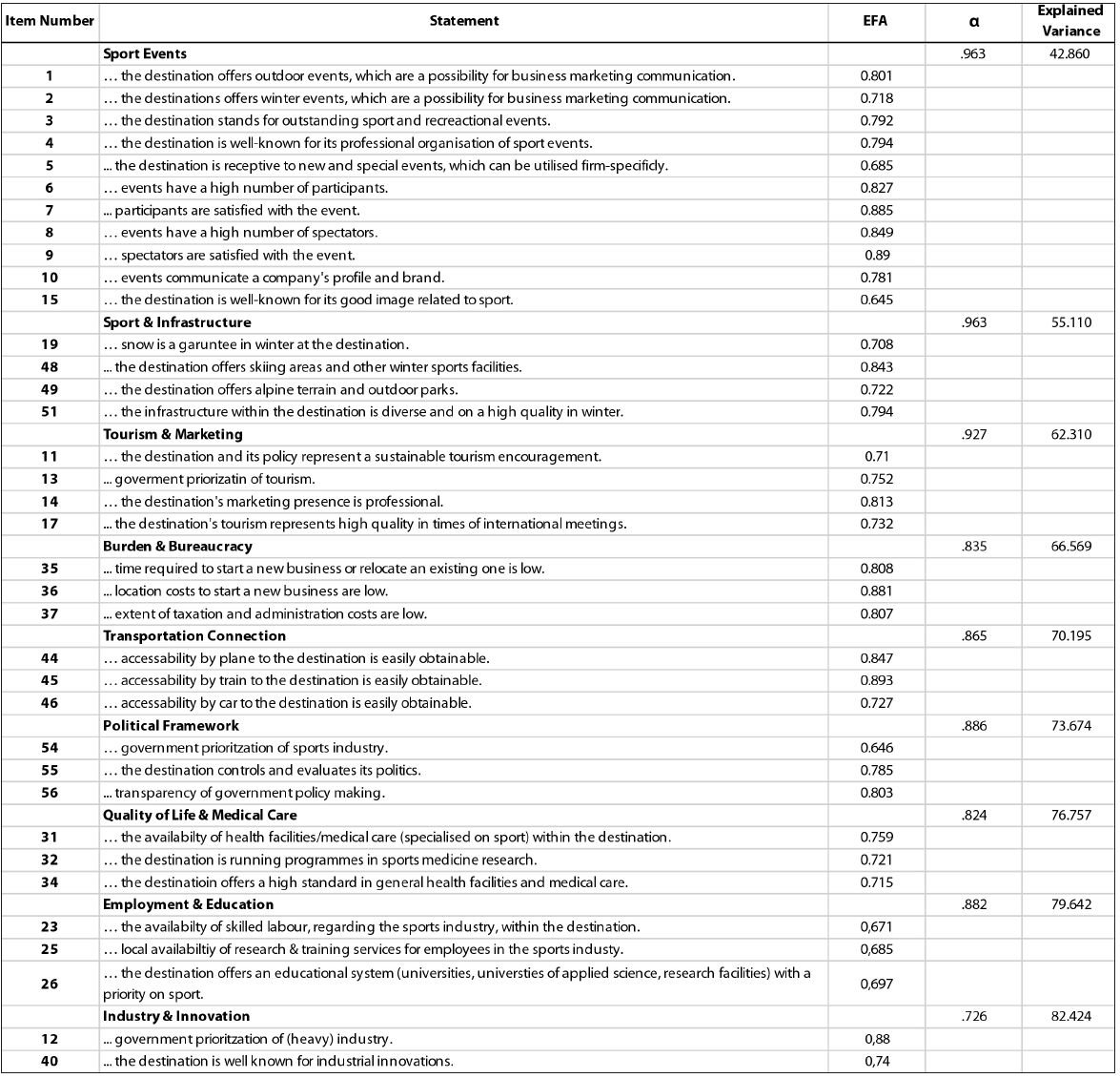 The identified dimensions were labelled as follows: Factor 1, “Sport Events”, bundles those items referring to events hosted by the destination such as winter and outdoor events and their athletes and visitors. Factor 2, “Sport & Infrastructure”, covers those items focusing on sport facilities, sport terrain diversity and quality. Factor 3, “Tourism & Marketing”, bundles those items addressing all marketing and tourism activities carried out by the destination. Factor 4 was labelled “Burden & Bureaucracy” as these items address the extent to which the cost of starting up and running a business influences the choice of a specific business location. Factor 5, “Transportation Connection”, deals with items concerning the role of transportation and overall accessibility of the destination. Factor 6, “Political Framework”, bundles the items referring to the focal points and framework conditions of the government and its policies at the destination. Factor 7, “Quality of Life & Medical Care”, covers those items focusing on the availability and quality of medical services and infrastructure. Factor 8, “Employment & Education”, bundles the items addressing the availability of qualified labour for the sports industry and opportunities for education and further training at the destination. Factor 9, “Industry & Innovation”, includes the items referring to the destination’s innovation potential and its image in terms of innovation and industry. In summary, all items and constructs used in the model showed very good reliability and validity and were thus acceptable for further analysis.
