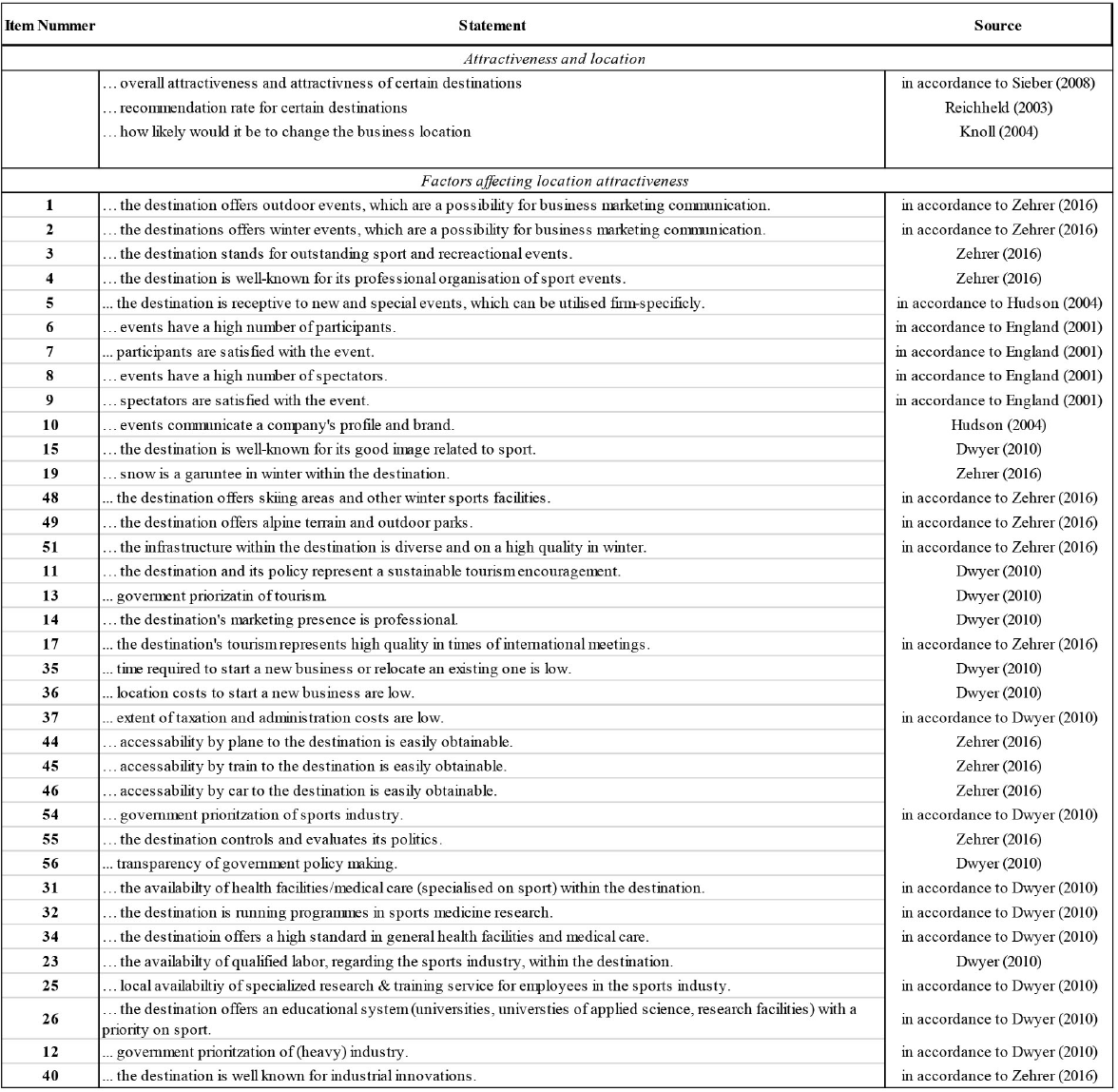 The destination competitiveness and management literature highlights a substantial number of variables or drivers for destination competitiveness. Based on the existing literature (Crouch, 2011; Dwyer & Kim, 2003; Enright & Newton, 2004; Hudson, Ritchie, & Timur, 2004; Knoll, 2004; Sieber, 2008; Zehrer et al., 2016), an online questionnaire was developed. The scale was defined to articulate the meaning and domain of attractiveness for sport manufacturing businesses looking to settle in alpine tourism destinations, and was based on insights from the literature. Finally, the questionnaire dealt with different topics: (1) Sport Events & Culture, (2) Sport Tourism & Hospitality, (3) Sport & Environment, (4) Sport Apprenticeship & Resident Population, (5) Sport & Economy, (6) Sport Infrastructure & Facilities, and (7) Sport Policy & Security. The items were derived from literature (see Appendix A) and modified to suit the context of sport.