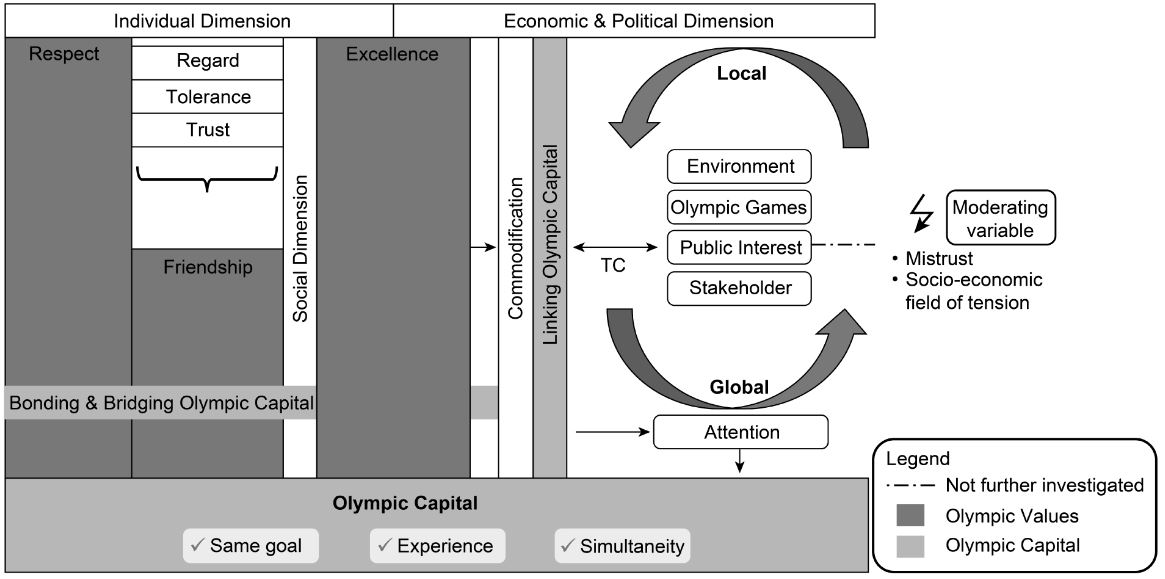 The Olympic movement and its primary product, the Olympic Games, benefit from the value foundation of Olympism (Coubertin, 2000), which is unique in the global sports world. This not only fosters the brand of the Olympic rings and customer loyalty (Davis, 2012; Seguin et al., 2008) but is also the starting point of social capital creation through the Olympic key values of respect, friendship and excellence. Along the perception, simultaneous experience and cultural practice of the Olympic values, they are transformed from the individual level to a collective level and, thus, form bonding and bridging social capital (Bourdieu, 1986; Putnam, 2000), particularly among Olympic athletes and spectators. At that point of the process, the commodification of the Olympic value of excellence leverages Olympic capital via extensive global media coverage and supplements linking social capital in the economic and political sphere.