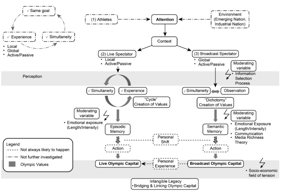receive (Ferrand & Pages, 1999; Mackenzie, 1986). In addition, the higher is the individual engagement with the object of social capital creation and the greater is the personal exposure, the larger the social capital generated (Misener & Mason, 2006; Olney, Holbrook, & Batra, 1991; Schulenkorf, 2009). However, the groups of spectators may not only differ in exposure to the Olympic Games but also perceive Olympic messages in varying contexts (Vargo & Lusch, 2016). Therefore, spectators from diverse national and cultural backgrounds may have different access to Olympic capital. In addition, the level of involvement has an impact on the perception of Olympic issues (Kurscheidt & Prüschenk, 2020; Schnitzer et al., 2018), such as future support of Olympic bids (Schnitzer et al., 2019). Moreover, viewers who collectively follow the Olympics (e.g., in a sports bar) are expected to have a different perception from those watching individually at home (Woratschek, Durchholz, Maier, & Ströbel, 2017). While such differentiations could be subject to further research, the following model in Figure 2 focusses on live spectators compared to broadcast spectators (Morley & Robins, 2002).