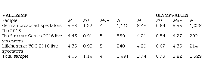 However, regarding OLYMPVALUES, the result is not confirmed. Here, the YOG attendees show slightly higher rates on average than the visitors of the Rio Olympics, while the TV viewers again rate the lowest. Here, the positive environment of the YOG may come into play. It may also be that people attending the less prestigious YOG tend to be more value oriented in general, while the Rio visitors instead seek outstanding entertainment at an event of global esteem.