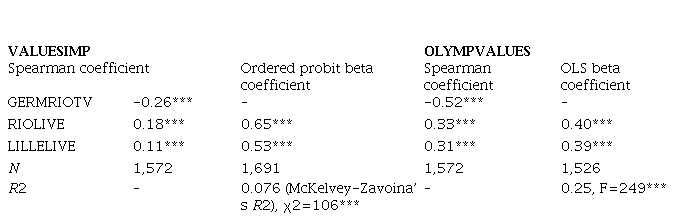 The Spearman rank correlations shown in Table 2 reveal high significances throughout and a consistently stronger posi- tive relationship between the proxies for Olympic capital and RIOLIVE compared with LILLELIVE. In contrast, GERMRIOTV is negatively correlated with VALUESIMP, documenting a distinct difference from the live spectators because RIOLIVE and LIL- LELIVE are positively linked to the value construct. Regarding
