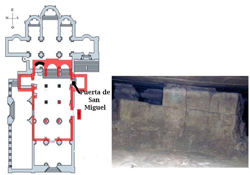 El último aspecto que vamos a valorar en esta iglesia es la posible presencia de estancias laterales junto a la cabecera, cuya existencia se plantea por haber conservado la cimentación de una cámara en lado norte, la cual fue utilizada como sacristía y base del campanario desde el siglo XII. Esta estancia plantea un interesante debate historiográfico sobre su origen y funcionalidad que ha llevado a tres propuestas diferentes: por un lado la de aquellos investigadores que desligan su construcción del edificio altomedieval y la consideran como la base del campanario realizado siglo XII, por otro lado los que piensan que pudo existir en este momento pero que, por imaginar el enterramiento del santo frente a la puerta opuesta, no tendría una cámara similar en el lado sur y, por último, los que defienden que la estancia norte debía tener una simétrica en el lado contrario[40]. Dentro de este debate creemos que la primera postura, la que considera la estancia como el campanario del siglo XII, debe descartarse por la coincidencia exacta de la cimentación con el ángulo del antiguo edificio prerrománico, lo que parece indicar que cuando se planifica aún no existía la ampliación románica[41]. Respecto a la segunda postura debemos recordar que la posición de la tumba del santo frente a la puerta de San Miguel, que impedía considerar una construcción en este punto, ya la descartamos en los párrafos anteriores, por lo que no sería argumento para rechazar su existencia.