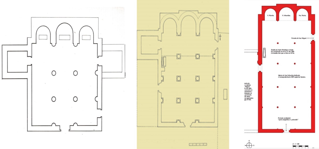 La reconstrucción de la primera iglesia que tuvo el monasterio de San Sebastián de Silos[11] en el siglo X resulta, sin lugar a dudas, la más compleja de todas las fases constructivas del edificio, pues la escasez de datos de la que se parte ha hecho que cualquier interpretación resulte siempre arriesgada. De hecho, en la larga trayectoria historiográfica del monasterio únicamente destacan dos propuestas para la reconstrucción de este primer templo; por un lado la de Bango, pionera en esta cuestión, que imaginaba una iglesia de nave única dotada de cámaras laterales y sección semicircular en el interior del ábside y, por otro lado, la de Palomero que proponía un edificio con el mismo núcleo básico de nave única y cabecera cuadrada pero sin los añadidos que había defendido el anterior investigador (fig. 3).