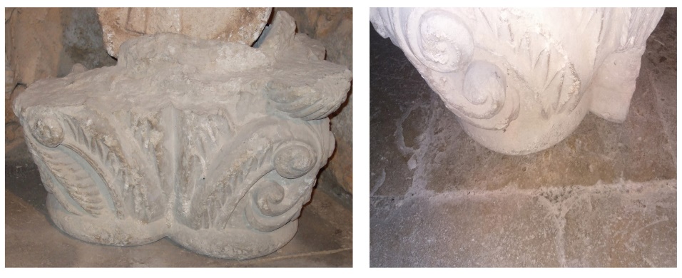 Fig. 13. Capitel cuádruple conservado en lapidario del monasterio. A la izquierda una vista frontal y a la derecha el arranque de las cestas posteriores fragmentadas.