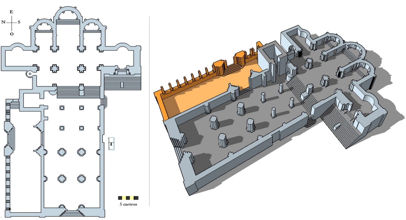 La existencia de un templo con tantas fases constructivas era el resultado de continuos proyectos de ampliación que vinieron a solaparse unos a otros, los cuales hacen que su interpretación general resulte compleja desde múltiples aspectos: la forma de los edificios en planta, los elementos decorativos que se asocian a cada parte, la imagen de los alzados, las posibles repercusiones sobre el proceso constructivo del claustro o la datación de cada fase. Todos estos interrogantes son el resultado de un conocimiento parcial de las estructuras del antiguo edificio que da lugar, inevitablemente, a múltiples hipótesis sobre las etapas constructivas. En este trabajo hemos intentado presentar de forma breve las propuestas más destacadas que los historiadores han realizado durante los últimos años para elegir, de forma razonada, las que consideramos más adecuadas para los modelos gráficos que presentamos. Con ello, hemos intentado ofrecer un recorrido ordenado y coherente que sirva como referencia sobre la forma que pudo tener cada una de aquellas etapas constructivas.