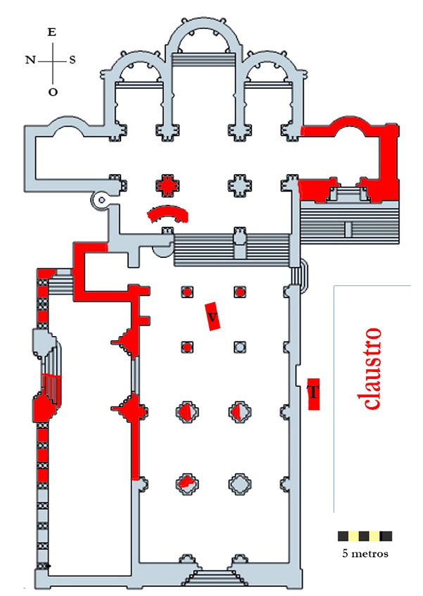 En este contexto la secuencia constructiva resulta, a nuestro juicio, relativamente clara y no encontramos argumentos convincentes que pudieran sugerir que las arquerías del claustro se hicieron después del transepto, a pesar de que existen algunas investigaciones que intentaron justificarlo de esa manera[67]. Del mismo modo, la compleja escalera que se construye y la destrucción de dependencias monásticas previas deja claro, como antes expusimos, que los proyectos de la ampliación oriental y el claustro se hicieron de forma independiente el uno del otro y no plantearon en origen, ni siquiera, una futura unión directa entre ambos espacios, por lo que la dependencia cronológica de uno respecto al otro no debe valorarse de forma tan determinante como a veces se ha hecho.