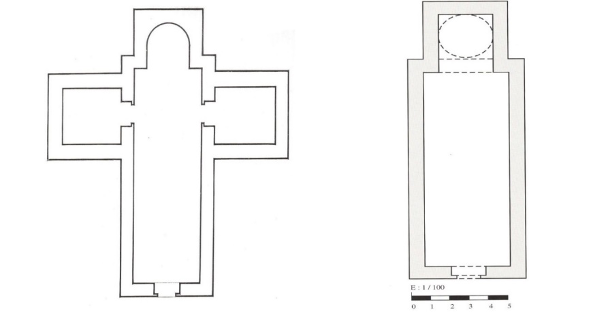 Fig. 3. Propuestas sobre la primera iglesia de Santo Domingo de Silos: Isidro Bango a la izquierda (Bango, 1990: 344) y Félix Palomero a la derecha (Palomero/Ilardia/Reyes/Maté, 1999: 38).