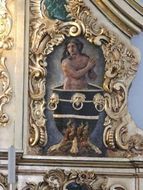 Lo que sorprende es que estos dos mediorelieves representen episodios de la vida de San Juan Evangelista, no los de San Juan Bautista, los contemplados en el contrato del siglo XVI. El de la epístola exhibe el primer capítulo de los “milagros de Juan”, recogiendo la prueba que hubo de soportar cuando fue arrojado a una caldera de aceite hirviendo por negarse a renegar de Cristo y cesar de predicar, saliendo más fresco y lozano que entró. Después de estos sucesos fue desterrado a la isla de Patmos donde escribió el Apocalipsis, el tema del segundo tablero conservado.