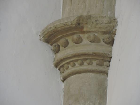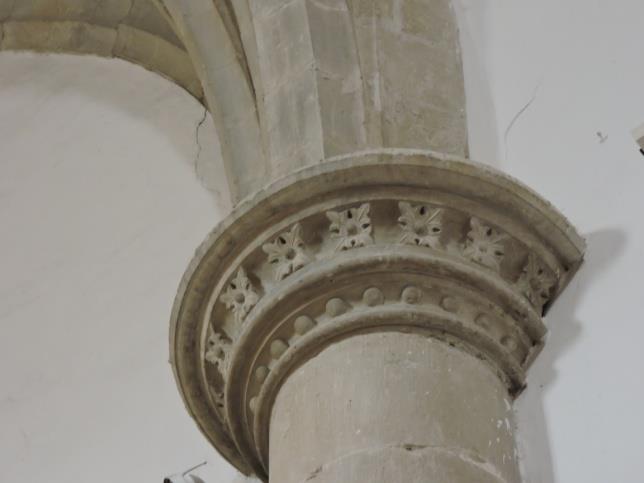 Mientras las dos bandas de los capiteles de las semicolumnas adosadas a las esquinas de la cabecera repiten el mismo motivo, bolas góticas, los situados en los capiteles ubicados junto a la nave principal están decorados por diminutas bolas en su banda inferior y hojas en la superior.