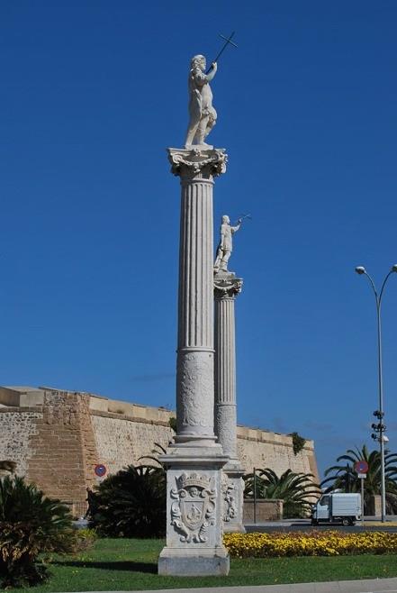 Pero, si en aquella parte de la ciudad, el triunfo y demás elementos importados de Génova consiguieron revertir su mala consideración urbanística, es posible apreciar por parte del cabildo municipal un interés evidente en construir los demás en la principal entrada de la ciudad, es decir, la del mar. Por ello, tanto las columnas de los Patronos como la de San Francisco Javier se colocaron en el muelle, a la entrada de la ciudad, para que sirvieran como primer escaparate ante los extranjeros que a Cádiz acudían (Fig. 14). También se proyectó para la misma ubicación la de la Virgen del Rosario, pero finalmente hubo que mudarla.