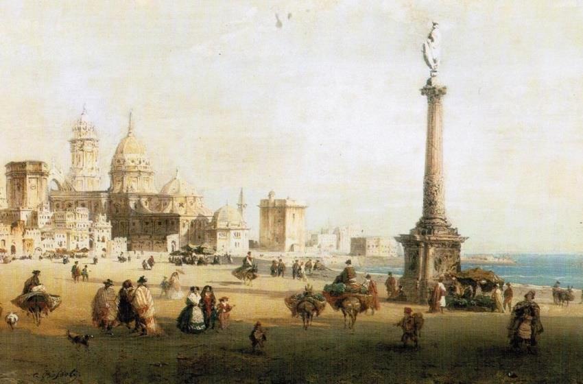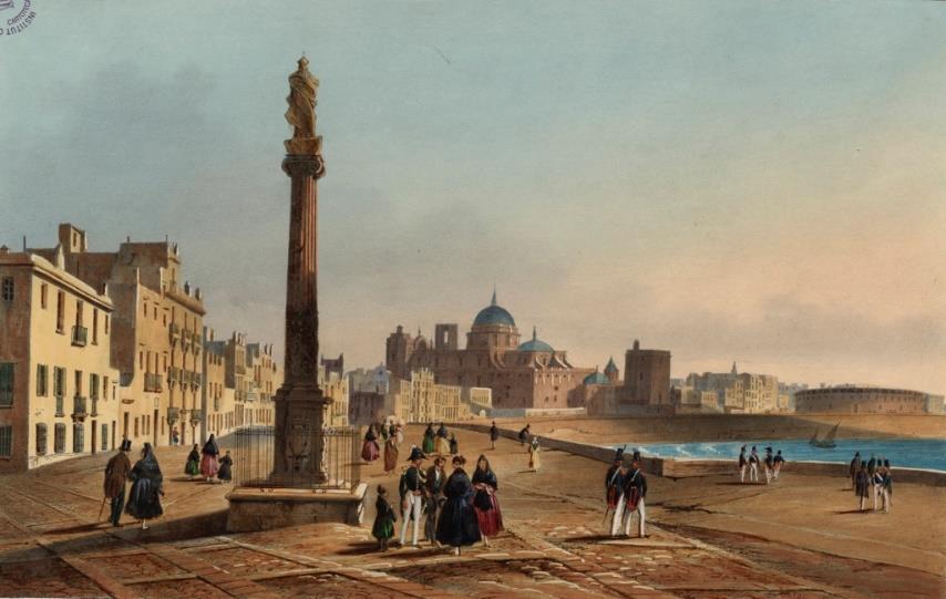 Por último, tampoco se puede pasar por alto el valor urbano no solo del triunfo que aquí nos concierne, sino del resto de sus semejantes. Ya comentamos anteriormente cómo el convento de Capuchinos estaba situado a finales del siglo XVII en lo que podemos entender como la espalda de la ciudad, dada su posición opuesta al muelle comercial y al resto de instituciones de importancia social, económica y política[34]. Sin embargo, esta situación fue revirtiendo, y en el siglo XIX muchos artistas eligieron este paisaje para retratar la ciudad, siendo de las pocas vistas de la ciudad de las que, aunque idealizadas, conservamos más de una obra (Fig. 12) (Fig. 13). A este triunfo se le sumó una construcción más en el siglo XVIII, la cual sucumbió a las pocas décadas, como era la Vía Sacra o Vía Crucis que se levantó entre el convento capuchino y la Catedral, cuyas 14 cruces de mármol fueron traídas de Génova por el fraile fray Fernando de Baza, y colocadas por impulso del cabildo secular tras la solicitud de fray Miguel de Valor, su compañero de religión[35]. Durante la misma centuria, fueron sufriendo los embates del clima, tras lo que fue necesario reubicarlas y, a finales de siglo, terminaron por desaparecer. Aun con todo, la presencia de la columna, con la Catedral Nueva al fondo, el concurso de personas que paseaban por allí y la presencia del mar, mucho más agitado aquí que en la cara de la bahía, fueron ingredientes que atrajeron las miradas de los vedutistas decimonónicos, quienes la escogieron para representar a la población, aun añadiendo elementos de naturaleza visiblemente ficticia.