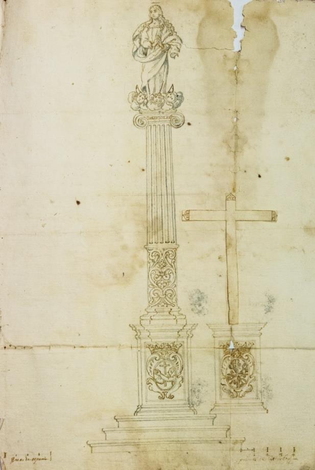 El de la Archicofradía de la Palma es un archivo histórico rico por la cantidad, tanto como por la calidad de los documentos que acoge, testigos de la vida y actividad multisecular de la institución desde su origen en 1691. Aquí, mostramos como documento de singular importancia el contrato de ejecución de la columna triunfal de la Inmaculada Concepción, hoy en día a la entrada de la gaditana punta de San Felipe, pero en origen erigida frente al convento de Capuchinos. Este importante documento, cuyo conocimiento para el mundo investigador ha sido reciente, se encuentra firmado entre fray Pablo de Cádiz, religioso de este orden, y Andrea Andreoli, prolífico artista que tendrá una especial labor como intermediario entre la clientela gaditana y los talleres de mármol genoveses[2]. En el recto, podemos leer el texto con las condiciones y los detalles del contrato (Apéndice documental. Documento 1), mientras que por el reverso se halla dibujado a tinta el diseño del mismo triunfo, una cruz en papel sobrepuesto y las medidas en varas castellanas y en palmos genoveses (Fig. 1).