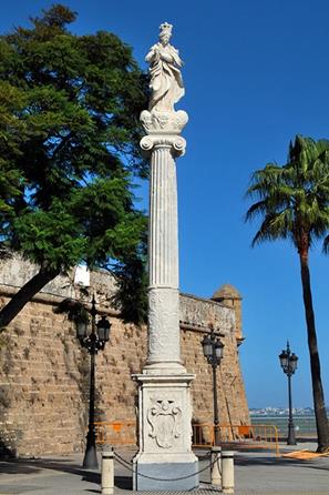 Fray Pablo, según su compañero Isidoro de Sevilla, solo pudo ver en Cádiz la efigie de la Virgen, que fue lo primero que se remitió, antes de su muerte acaecida en noviembre de 169414. Tras el óbito, debieron llegar entre noviembre de ese año y abril de 1695 la columna y demás elementos marmóreos, ya que en el cabildo municipal del [14] de dicho mes y año se dejó escrito que, por una parte, los diputados de la obra no tenían ningún inconveniente para su erección en el sitio dispuesto y, por otra, don Ignacio de Henestrosa refirió que el guardián del convento de capuchinos fray José de Sevilla y fray Félix de Aramayona, a quien estaba cometida la obra por muerte de fray Pablo, le habían ido a ver para que “se dispusiesse quanto antes [el triunfo] por el daño que las piezas de mármol que están delante del dho Combento reciven de los muchachos”[15]. El mismo Ignacio de Henestrosa, quizás por dejación de los diputados, fue a reconocer la obra, y manifestó en el dicho cabildo que a las cinco varas que se habían pedido originalmente había que añadir tres más, “para unas barandas de fierro que las an de rodear, y en cuyas espigas a trechos se an de poner faroles que alumbren a nra Sra y no ser de embarazo para que tres o quatro coches puedan pasar juntos por ambos lados para las hermitas de sta Cathalina y sn Sebastián”. Sobre la colocación de la misma, declaró él mismo que “la Sta Ymagen de nra Sra fue de parecer se colocasse mirando a esta ciudad, y de la misma forma en el Pedestal su escudo de Armas, y que el de la religión mirase al Combento, y en los otros dos las Piedras referidas a la parte de la mar la del Capuchino de rodillas, y al contrario la del escudo de sto Domingo, que la Sta Cruz se ponga al reverso de la Sta Ymagen de nra Sra y mirando al dho Combento, de forma que aunque la Columna que tiene cinco baras y tercia de alto está puesta sobre dho Pedestal como biene dispuesto, descubran los brazos los que fueren a dho combento respecto de que el Árbol lo oculta lo grueso de la Columna y que es desensia no puede estar de otra manera”.
