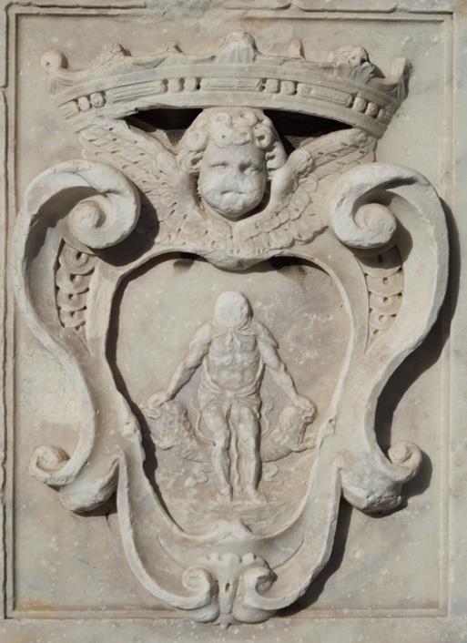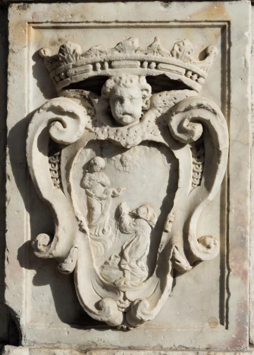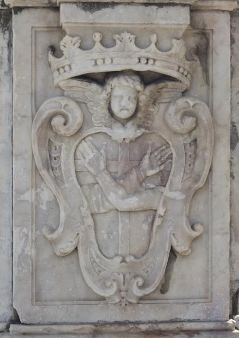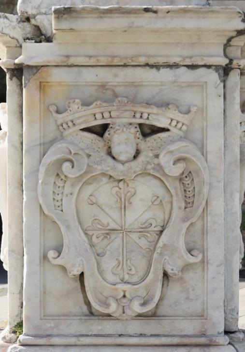 Andrea Andreola -o Andreoli según la historiografía-, artista que se ha venido conociendo de manera más exacta en fechas recientes, servía como intermediario entre la clientela gaditana y los talleres genoveses y carrarenses, especialmente tras el éxito cosechado por el retablo de la nación ligur de la Catedral de Santa Cruz[11]. Para este trabajo, Andreoli debió de buscar un artista para elaborar, según se ve en el documento, una columna sobre plinto que se levanta sobre tres escalones, y encima de la cual se dispone una imagen de la Inmaculada Concepción (Fig. 3). Estos escalones o gradas son unas de las prescripciones del contrato según se detalla en su texto, cuestión que no ocurre con las caras del plinto o pedestal, donde no se especifica ningún tipo de decoración a incluir. La cara que se muestra de este elemento presenta el escudo de la orden capuchina inserto en un escudo con corona en su parte superior (Fig. 4) y, junto a él, otro con la heráldica dominica (Fig. 5). En la obra definitiva, aparte de estos dos escudos, se incluyen el de la ciudad (Fig. 6) y el de fray Pablo arrodillado rezando el rosario ante la Inmaculada, el cual es el peor conservado, debido a la posición que ocupaba de cara al mar (Fig. 7). Sobre el plinto, se dispone la columna de orden jónico, que arranca con toro, escocia y bocel y cuyo fuste se completa con acanaladuras, salvo en su tercio inferior, en el que se dispone decoración con motivos de lacería y vegetales. Encima del capitel, resuelto según las prescripciones de su orden, se alza la figura de la Inmaculada Concepción sobre una nube de querubines de la que sobresalen los picos de la media luna.
