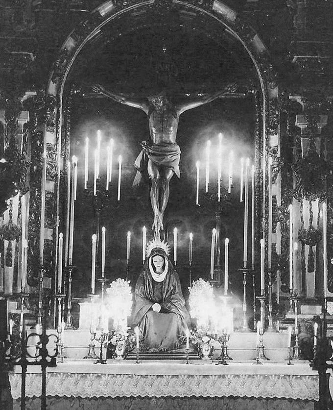 Fig. 2. Capilla de las Ánimas (detalle de la hornacina principal flanqueada por estípites y de las imágenes del Crucificado y la Dolorosa). Antes de 1931. Iglesia de San Juan Bautista. Málaga. Foto: [Colección particular].