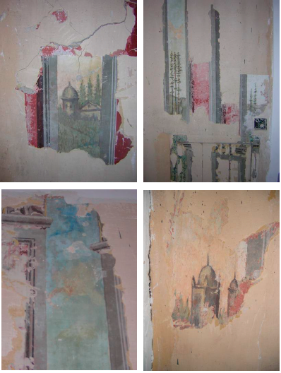 Centraremos el estudio en las catas realizadas en las paredes de la hornacina-camarín, las cuales revelan una representación pictórica de carácter paisajístico y arquitectónico. La misma se estructura a través de una serie de pilares ‒al menos dos a cada lado de la hornacina‒ entre los cuales se vislumbra un paisaje donde observamos tanto edificios turriformes rodeados de vegetación como diferentes especies arbóreas. La composición de dicho paisaje se presenta con la línea del horizonte dispuesta a la altura del primer tercio de los soportes fingidos, dejando el resto de la altura de los paramentos para el desarrollo de un celaje de tonos azules y verdosos. Suaves cumbres de montañas de tonos marrones marcan el citado límite entre el cielo y la tierra y el fondo de la vista, desplegándose en primer término diversas especies arbóreas. En el caso de las del lateral derecho de la hornacina, los árboles se disponen paralelamente en grupos de dos y tres ejemplares, y presentan alzados muy esbeltos con finos troncos de extrema verticalidad y ramas de proyección horizontal y escasa frondosidad. Por su parte, el lado izquierdo concentra la presencia de arquitecturas, concretamente dos edificios cuyas cubiertas y torres emergen entre el montuoso paisaje, enmarcados por lo que parecen abetos.