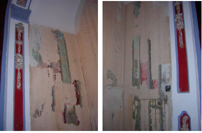 Figs. 8 y 9. Vista general de las catas realizadas en ambas paredes laterales de la hornacina-camarín. Capilla de las Ánimas. Iglesia de San Juan Bautista. Málaga. [Autor].