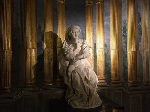 No obstante, será la capilla el elemento que concentre nuestra atención. La misma, parece que fuera diseñada en su conjunto para acoger como pieza principal la imagen escultórica de la Virgen con el Niño ‒también conocida como Madonna Carrega‒ realizada por el artista francés Pierre Puget hacia 1680. No está claro el origen de la pieza, pero es probable que fuera encargada en dicho año por algún miembro de la familia Balbi, en cuyo palacio se tiene constancia de la presencia de la escultura en 1717. Entre 1734 y 1744 pasaría a manos de la familia Carrega, permaneciendo en la capilla palaciega hasta el primer cuarto del siglo XIX cuando, finalmente, la mansión será adquirida por la saga de los Cataldi y la imagen abandonaría dicho espacio. Una réplica de la escultura mariana ocupa de nuevo la capilla desde el año 2004 ‒coincidiendo con la Capitalidad Europea de la Cultural de la ciudad‒ promovida por la Cámara de Comercio de Génova que ocupa en la actualidad el palacio (fig. 11).
