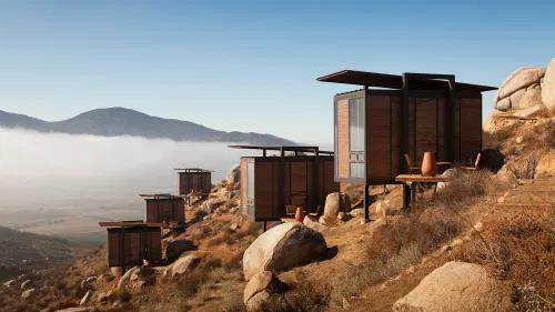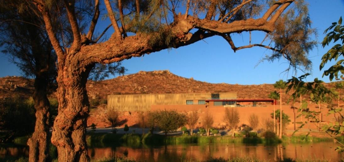 Es una arquitectura consciente y ecológica para el diseño de un hotel que se mimetiza con el majestuoso paisaje rodeado de viñedos. Se usó principalmente acero y madera ecológica de tala controlada y materiales reciclados. La sencillez de las líneas y el uso de materiales autóctonos, fueron el diseño elegido para resaltar el ascetismo del desierto y acentuar cualidades indígenas de la zona. Se diferencia por mantener un respeto por la naturaleza sobre la que se encuentra. En Encuentro Guadalupe se presenta la ocasión de apreciar los paisajes y la naturaleza a través de una arquitectura sobria, donde se distingue una armonía entre el medio ambiente y la obra.[30] (Figura 7).