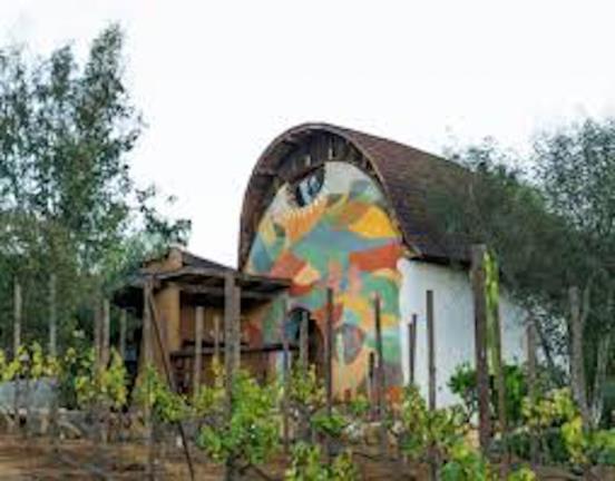 Vinícola Bruma y hotel boutique Casa 8, creada en 2015. Es un proyecto conformado por una vinícola, hotel y villas. El despacho TAC del Arquitecto Alejandro D’Acosta fue el que elaboró este creativo proyecto en el Valle de Guadalupe. Tanto la vinícola como el hotel surgieron a partir del diseño de paisaje considerando la vegetación natural del sitio, están integrados completamente al entorno, a pesar de ser de gran magnitud, apenas se distingue a lo lejos, apunta el arquitecto Alejandro D’Acosta. La mayor parte del proyecto es madera reciclada de la región con estructura de acero. Cubierto por un paisaje elaborado también con la vegetación existente en el sitio, cuenta con un espejo de agua que además de ser parte del diseño funciona como aislante natural.[39] Para el hotel se fueron creando habitáculos con rocas y jardines para producir un ambiente de privacidad resguardado por árboles y viñedos, logrando que el huésped tenga la impresión de dormir en el jardín. Se fusionan el espacio interior con el exterior utilizando ventanales y puertas corredizas. Se crearon jardines usando la misma tierra del sitio, que forman parte del diseño arquitectónico del lugar.[40] (Figura 12).