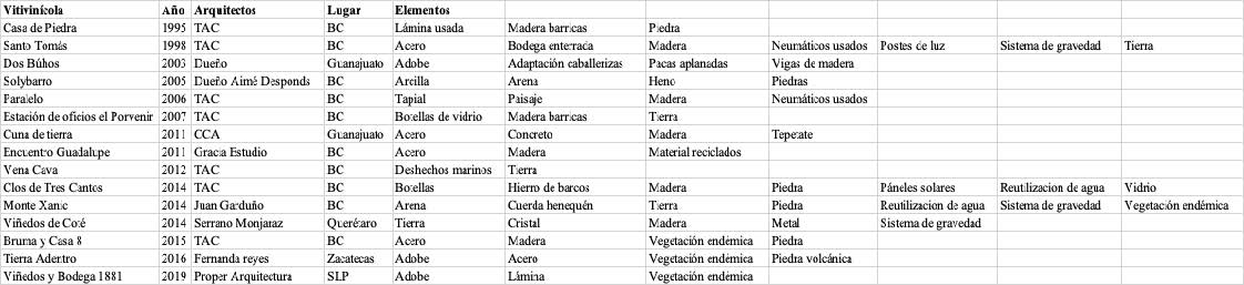 Una característica diferenciadora de la zona vitivinícola de Baja California ha sido que han logrado enlazar la arquitectura con el paisaje vinícola. Existe la cultura del reciclaje y saben aprovechar todos los desperdicios que se encnuentran en el lugar. Esta nueva arquitectura está legitimando su manera de hacer al reciclar y construir con lo que encuentra en su entorno. Los siguientes proyectos vitivinícolas contemporáneos presentan características de la arquitectura vernácula, la mayoría se encuentra en Baja California y han sido proyectos del Arquitecto Alejandro D’Acosta y algunas en otras regiones de México. Se presentan en órden cronológico por año de construcción (Figura 1).