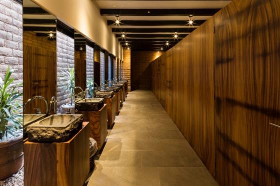 El orgullo de esta obra son las manos de obreros y artesanos mexicanos que hacen posible la realización del proyecto. Los lavamanos están inspirados en los molcajetes mexicanos y hechos especialmente para este proyecto por el artesano galardonado Ignacio García de San Lucas Evangelista, reconocido por su trabajo con la piedra volcánica. El riego y los canales de agua son parte del sistema agrícola. El agua en movimiento es vida y el ser humano por instinto sigue su sonido y su contemplación. Tres elementos con agua en movimiento limitan el terreno elevado para contemplarlos junto al paisaje. De manera perpendicular al pabellón de tierra, se erige un pabellón de acero y cristal, el cual es un mirador con servicio gastronómico desde el que se aprecia la vinícola y los viñedos desde un nivel superior.[43] (F. Reyes, comunicación personal, 15 de noviembre de 2019) (Figura 13).