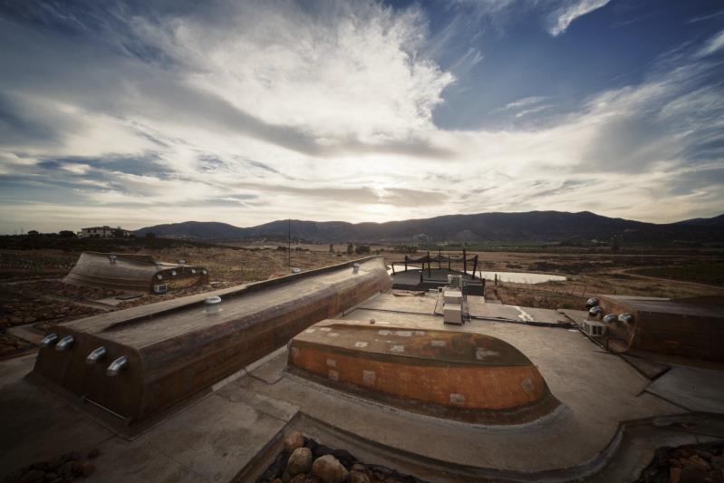 Vinícola Santo Tomás, creada en 1998, desarrollada también por TAC. Esta bodega se encuentra en el Valle de Santo Tomás en Ensenada, Baja California. De acuerdo con Alejandro D’Acosta se buscó una ubicación adecuada que fuera eficaz considerando los accesos, los vientos, los cultivos, el equipamiento, pero optaron también porque estuviera en una pequeña montaña que sirviera como hito en el paisaje. De tal suerte que la disposición fuera eficaz en las funciones de energía y de fabricación de vino. Se desarrolló un sistema radial reconocido como el más eficiente para la producción industrial y que contiene menos distancias entre sus partes y por ende el más eficaz y cuidado para la producción del vino, de manera que se eliminaron el uso de bombas y todos los procesos son por gravedad. Para regular la temperatura, se cubrió el edificio para aislarlo con tierra del lugar y se construyeron muros de 90 cm. de espesor. Las cavas están bajo el nivel del subsuelo, optimizando así el recurso de pérdida de calor y dominio de la temperatura deseada [19] (Figura 2).