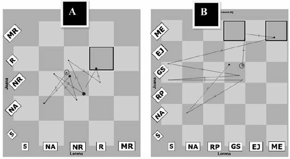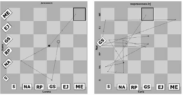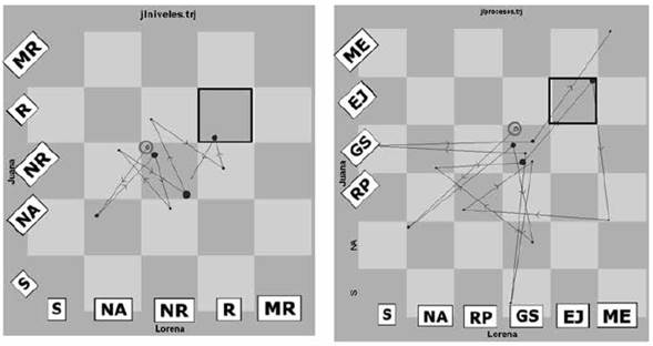 Las matrices espacio-estado se utilizaron para analizar el comportamiento, la trayectoria o el cambio de los niveles de verbalización y de los procesos de resolución de problemas poco estructurados, mientras las díadas desarrollaban la tarea. Dado el ingente volumen de los datos, a continuación se expondrán solamente los aspectos más relevantes y reiterativos. En primera instancia, se hará énfasis en los niveles de verbalización, y después en los procesos de resolución de problemas poco estructurados.