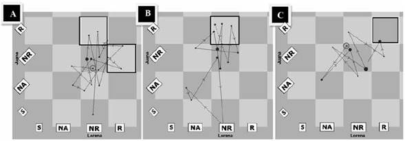 Se observó que las participantes se involucraron de diferentes maneras en las verbalizaciones reguladas: en ocasiones-trece oportunidades-, ambos miembros de las díadas interactuaban, haciendo intercambios simultáneos de verbalizaciones reguladas (figura 2, imagen C). En otros momentos, las integrantes de la pareja interactuaban produciendo verbalizaciones reguladas, pero no simultáneamente, sino por turnos (figura 2, imagen A). Con mayor frecuencia-casi cincuenta veces- un miembro de las díadas realizó las verbalizaciones reguladas, mientras que el otro correspondía con verbalizaciones no reguladas o de otro tipo (figura 2, imagen B).