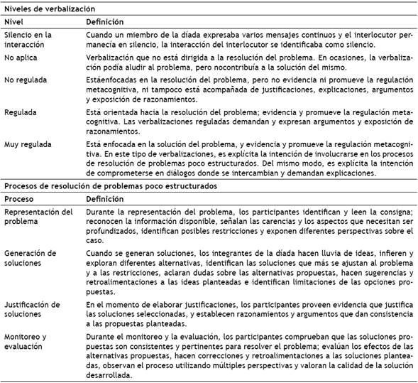 Los participantes resolvieron la tarea en díadas, pero las codificaciones fueron asignadas a cada participante. Una verbalización se codificaba en un nivel superior en la medida que evidenciaba y promovía la regulación metacognitiva. Al mismo tiempo, se identificaba a qué proceso de resolución del problema poco estructurado estaba asociado el mensaje.